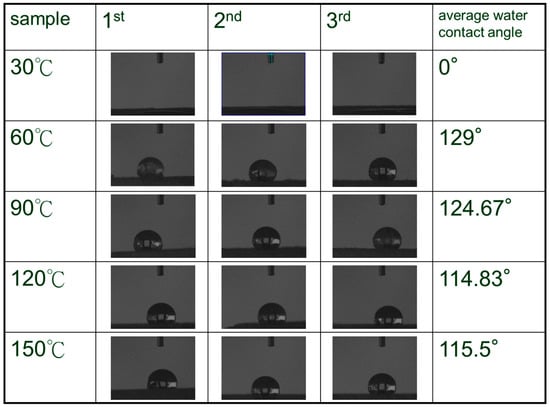 The hydrophobic function is often demonstrated with water contact angle and is sometimes referred to as “lotus effect”. Hydrophobicity is controlled both by hydrophobic substrate film and the roughness of the surface. To show the lotus effect, hydrophobicity as the basis for self-cleaning mechanism, the organic interaction characteristic of cement surface was measured by contact angle. The organic additive changes the property of concrete material in situ, Figure 6 and Figure 7a show the contact angle of the cement surfaces obtained at different carbonation reaction temperatures. At lower reaction temperature (30 °C), the contact angle against the hydrophobized cement surface was zero. The contact angle increased to 129 and 125° respectively for the temperatures 60 and 90 °C. Temperature increases the efficient interaction of stearate molecules and Ca2+ and CO32− inducing hydrophobic calcite hence an increment in the contact angle. However, further increase in temperature caused a slight decrease in the contact angle and remained constant after 90 °C. The surface roughness also seems to play an important role in enhancing or decreasing the hydrophobicity [29]. The results of IR and contact angle are in accordance with each other. On the other hand, contact angle of Ctrl-2 experiment at 90 °C was found to be ~80° (other samples were not studied); this indicates that CO2 plays an important role in enhancing the hydrophobicity of the cement surface.