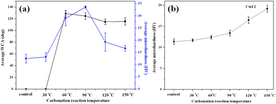 (a) Double Y axis graph showing contact angle of the cement surface against water and micro hardness of cement blocks obtained at different carbonation reaction temperature; (b) microhardness of cement cubes of Ctrl 2 experiments.