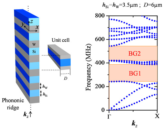 We first consider an infinite phononic ridge or plate composed of alternating silicon (Si) and tungsten (W) layers (a periodic beam) in z direction, having the same thickness h, while both layers have the same width D (Figure 1). The system is considered infinite along y direction. When choosing h = 3.5 µm and D = 6 µm, the band structure of the system displays two BGs, denoted BG1 from 243.7 to 387.4 MHz and BG2 from 421.3 to 543 MHz, for wave propagation along the z direction (Figure 1). The calculations are based on finite element method using Comsol Multiphysics© software (Comsol, Stockholm, Sweden).
