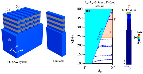 Regarding the SAW dispersion, we built a PC structure using a periodic repetition of finite phononic ridges on the surface of a thick silicon substrate (Figure 2a). Each ridge is made of 3 Si/W cells, ending with a last Si layer on top. The repetition period of the ridges is a = 7 µm (the cell period), and the band structure calculation was performed using a unit cell with periodic boundary conditions (PBC) (Figure 2b). The X’ point indicates the Brillouin zone limit π/a in the propagation direction x for SAW. The blue line corresponds to the Si sound line so that the modes located in the cyan shaded region are BAW or leaky surface modes that can radiate into the bulk silicon substrate. The modes located below the sound line are either confined within the surface of the Si substrate or inside the ridge. Some of the modes appear in the orange shaded region which corresponds to the phononic ridge band gap BG1. The modes located in this region cannot propagate into the Si substrate or in the whole ridge. They can only be confined in specific regions of the ridge, as we will see below. The other SAW branches outside the BG1 correspond to modes where the elastic energy is spread all along the ridges.