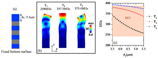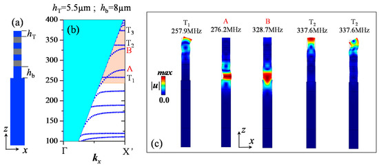 This time, we considered the case where we also changed the thickness of the Si layer at the bottom of the ridge, denoted hb, in contact with the substrate (Figure 5a). Figure 5b shows the band structures when hb is chosen to be 8 µm, while the top Si layer thickness is hT = 5.5 µm. The other Si and W layers have their thicknesses fixed to 3.5 µm. We also displayed in Figure 5c the total displacement field amplitude |u|, together with the shape of the deformation for the modes inside the band gap BG1 at X’ point. In addition to the presence of the resonance modes T1, T2, and T3 where the mechanical vibration is confined in the top Si/W layers, we observe the appearance of two modes denoted A and B in the band structure inside the BG1 (shaded orange region) (Figure 5b). The displacement field maps of these modes show that they are local resonance modes with almost zero group velocity at the X’ point of the first Brillouin zone. For both modes A and B, we can clearly see that the elastic energy is confined within the bottom Si/W layers close to the substrate surface, with a quickly decaying of the displacement amplitude along the upper Si/W layers and almost no vibration in the top layers of the ridge. Furthermore, when analyzing the mode’s deformation shape, we can clearly see that mode A has flexural-like vibrations of the ridge. The mechanical vibrational motion of mode B is mainly along z direction and corresponds to a compressional-like vibration where the two bottom Si and W layers are stretched and compressed along z direction. Furthermore, one can observe in Figure 5 that the defect modes T1, T2, and T3 are in the same frequencies as in the case of Figure 4 since these modes are not affected by the thickness change of the bottom Si layer.