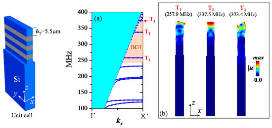 We then investigated SAW dispersion with periodic repetition of finite phononic ridges over the Si substrate surface when changing the top Si layer thickness hT. Figure 4a shows the band structure calculation in the case of hT = 5.5 µm. In the frequency range of the band gap BG1, we can depict three local resonance modes with zero group velocity. We also display in Figure 4b the displacement field amplitude and the deformation profiles of these modes to identify their mechanical behavior. When analyzing the displacement fields, we can clearly identify the flexural resonance modes T1 and T3, and the compressional mode T2, which correspond to the same modes depicted in Figure 3b. Furthermore, the modes T1, T2, and T3 are located at 258, 337.5, and 373.4 MHz, which are at the same frequencies as in the case of isolated ridges presented in Figure 3. We can easily tune the frequency of these localized resonance modes inside the BG1 region by changing the upper Si layer thickness of the ridges.