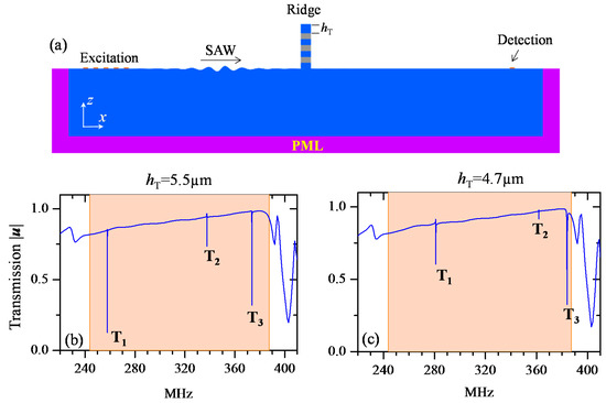We also chose to represent the deformation (with a scale factor for the sake of clarity) for each point of the ridge at the same instant of time chosen for the component plot in the substrate. We clearly saw that the dips originate from the excitation of resonance modes where the mechanical vibration is localized in the top Si/W layers of the ridge. They correspond to the resonance modes T1, T2 and T3 observed in Figure 4 at the same frequencies. The dips are created by the excitation of the resonance modes which couples with Rayleigh waves, causing narrow band transmission loss with part of the elastic energy radiating into the bulk substrate. More precisely, when the SAW hits the ridge, an amount of the elastic energy is transmitted through the ridge inside the BG, as we considered only three cells. The resonance modes would then be excited in the top of the ridge. One can consider the top Si/W layers as a cavity where the elastic energy is stored at the resonance frequency and scattered back along the ridge into the substrate. This mechanism results in SAW dips (loss) in the transmission spectrum in a narrow band corresponding to the resonance modes. Also, it seems that the coupling is stronger for the flexural surface modes T1 and T3 where higher SAW attenuation is depicted, compared to the case of the compressional mode T2. Furthermore, when looking closely to the mechanical vibration amplitudes, we noticed that at the modes resonance frequency, the maximum of the displacement amplitude in the ridge was at least one order of magnitude higher than the amplitude of SAW for the three dips. Additionally, an interesting feature displayed by this system is that we could easily tune the frequencies of the dips only by changing the thickness hT of the top Si layer. When lowering the value of hT from 5.5 to 4.7 µm (Figure 6b,c), the dips frequencies could be increased inside the band gap BG1. The three dips experienced high mechanical QF, which was evaluated at 2.8 × 104, 1.85 × 104 and 7.2 × 103 for the three modes T1, T2, and T3 respectively in Figure 6c, for instance.
