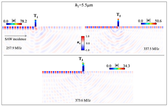 Total displacement field in the ridge as well as the component in the Si substrate for SAW at the frequencies of the modes T1, T2 and T3 indicated in Figure 6 for hT = 5.5 µm.
