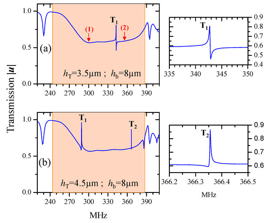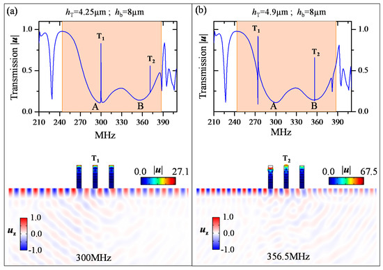 Finally, we calculated the SAW transmission over three phononic ridges 21 µm apart to avoid interaction between the ridges. The ridges had their bottom Si layer thickness fixed to hb = 8 µm. In Figure 10, we plotted the transmitted SAW amplitude where the top Si layer thickness hT was chosen to 4.25 µm (a) and 4.9 µm (b) respectively. First, we could distinguish in both transmission curves the existence of two large attenuation bands indicated by A and B which corresponded to the flexural mode and the compressional mode in which the mechanical vibrations were confined within the bottom Si/W layers of the ridges. We can clearly see the overlapping of the resonance bands of modes A and B where the transmission is at 11% and 14% respectively. Meanwhile, in Figure 10a, we chose the thickness hT = 4.25 µm so that the resonance mode T1, which has flexural mechanical motion on the top Si layer, falls exactly at the attenuation region caused by the mode A. The coupling between the two modes results in a high transmission peak of 83% at the T1 mode’s frequency 300 MHz. Both modes had the same mechanical motion nature, i.e., flexural vibration, which explained their strong coupling. The total displacement field amplitude in the ridges and the component in the substrate plotted in the lower panel of Figure 10a, showed the excitation of the resonant mode T1 in the three ridges by the SAW at the peak frequency (300 MHz) along with the transmitted SAW. We also had the same behavior in the attenuation band B by coupling this mode with the resonance mode T2, knowing that they both had the same mechanical motion nature, i.e., compressional vibration. In fact, by choosing Si top layer thickness hT = 4.9 µm, the frequency of the compressional mode T2 could be tuned to fall into the attenuation band B where the coupling between the modes resulted in the creation of the peak T2, as depicted in Figure 10b. At the frequency 356.5 MHz of the peak T2, a maximum transmission of 66% was reached for SAW. When analyzing the total displacement field amplitude in the ridges and the component in the substrate plotted in the lower panel of Figure 10b, we could clearly see the excitation of the resonance mode T2 in the three ridges by the SAW. The QF of mode T1 is about 1200 in the case of hT = 4.25 µm (Figure 10a) while the QF of mode T2 is 2.89 × 104 in the case of hT = 4.9 µm (Figure 10b). Moreover, for the two cases where either the resonance mode T1 falls into the dip band A or mode T2 falls into the band B, we had a situation very close to an acoustic analogue of electromagnetically-induced transparency (EIT) [60,61]. In fact, in plasmonic crystals for instance, the coupling between localized surface states (known as Tamm states) and the defect plasmonic state give an EIT-like behavior [62].