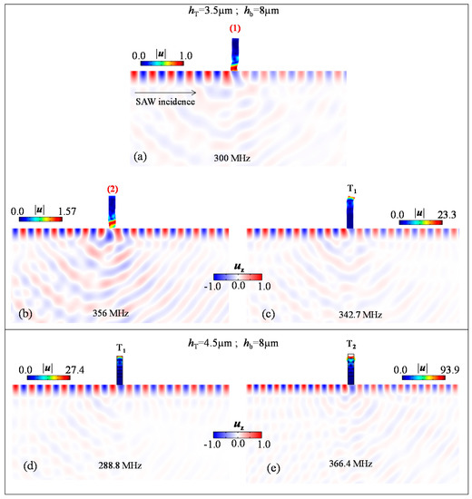 Meanwhile, we plotted in Figure 8b the transmission spectrum for the case where we increased the thickness of the Si top layer hT to 4.5 µm while hb was fixed to 8 µm. We observed the existence of two peaks at 288.8 MHz and 366.4 MHz where we had 96% and 87% of the maximum SAW transmission respectively. When analyzing the displacement field shapes of these two peaks displayed in Figure 9d,e, one can easily conclude that they correspond to the resonance modes T1 and T2, which are excited at their natural frequency, as we could deduce from Figure 3c for the chosen hT = 4.5 µm. From Figure 8, we concluded that upon increasing of the top Si layer thickness hT, the frequencies of modes T1 and T2 decreased so that T2 falls into the BG1 region when hT = 4.5 µm.
