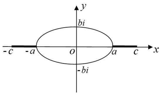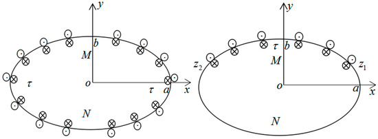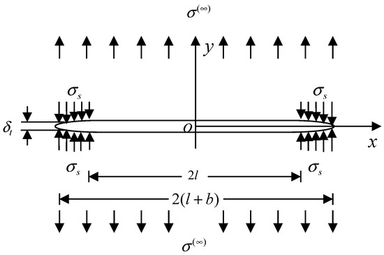 The mapping maps the inner angle of the unit circle on the mathematical plane to the infinite plane of the elliptical hole with double cracks on the physical plane, and , , , . Meanwhile, the shore point is mapped to the point , and the lower shore is mapped to the point . In the fracture theory, defining the complex stress intensity factor is