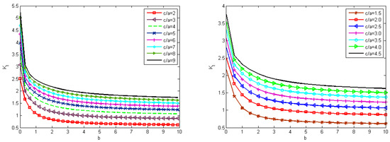 If we regard static stress intensity factor of mode I centric crack problems as the normalized stress intensity factor, then the dimensionless stress intensity factor can be introduced as . The comparison of the normalized stress intensity factor of various crack radio is depicted in Figure 4.