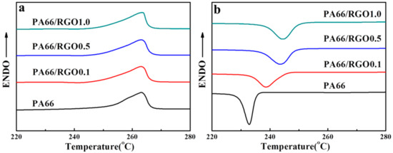 (a) The heating curves and (b) the cooling curves of neat PA66 and PA66/RGO0.1, PA66/RGO0.5 and PA66/RGO1.0 nanocomposites.
