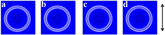 The 2D-SAXS patterns of (a) PA66, (b) PA66/RGO0.1, (c) PA66/RGO0.5 and (d) PA66/RGO1.0. The sample-to-detector distance was 5210 mm. The direction of the double-arrow was parallel to the flow direction.