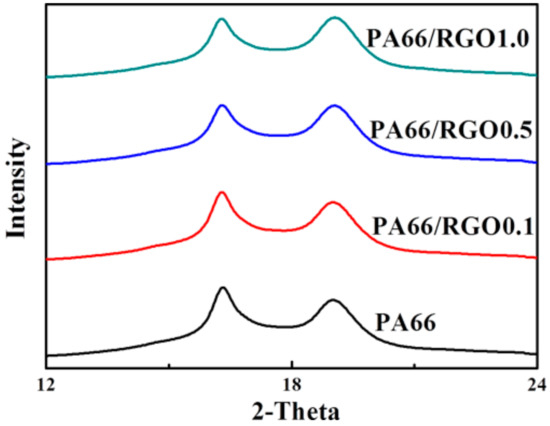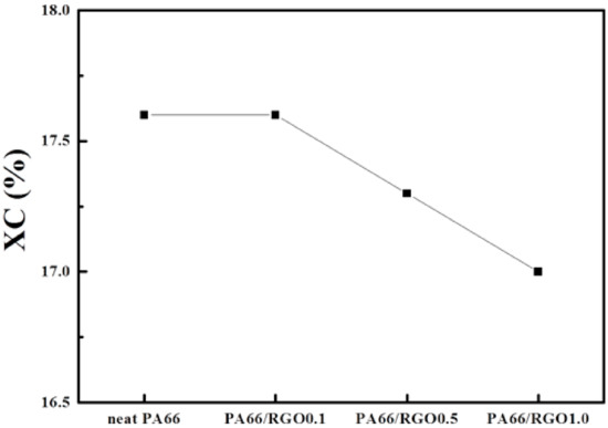 The crystalline degree of neat PA66 and PA66/RGO0.1, PA66/RGO0.5, and PA66/RGO1.0 nanocomposites.