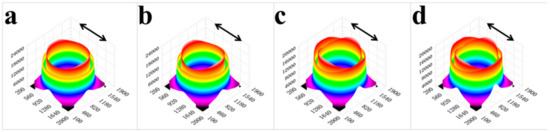 Furthermore, the WAXD was used to study the effect of RGO nanofillers. In the non-isothermal crystallization process, fewer PA66 crystals exist in the test samples. The change of the orientation of the neat PA66 and PA66/RGO nanocomposites is hardly observed in 2D-WAXD patterns. The 3D-WAXD patterns were obtained from Figure 2, as shown in Figure 5. With the increase of RGO, the two diffraction rings have no obvious change in the 2D-WAXD patterns (Figure 2) but the intensity and orientation of the two diffraction rings of the crystal planes changed in the 3D-WAXD patterns (Figure 5). In the 3D-WAXD pattern, the orientation of the (100) crystal plane is perpendicular to the flow direction, intensity and orientation of the (010) enhanced crystal plane when RGO is added into the PA66. In Figure 5a, the weak crystal orientation of the neat PA66 bar is parallel to the injection flow direction. When the 0.1 wt% RGO is added, because only a small number of epitaxial crystals exist, the orientation of PA66/RGO0.1 nanocomposite is akin to that of the neat PA66 (Figure 5b). However, the degree of orientations of PA66/RGO0.5 and PA66/RGO1.0 nanocomposites increases (Figure 5c,d). In the injection process, the chains of the PA66 and RGO are subjected to an intensive shear flow and are parallel to the flow direction. The relaxation of PA66 chains occurs in non-isothermal crystallization, but RGO can restrict the mobility of the PA66 matrix chains by H-bond interaction and epitaxial crystallization. Therefore, the orientation of PA66/RGO nanocomposites is enhanced.