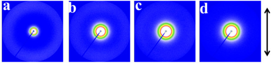 The 3D-WAXD patterns of (a) PA66, (b) PA66/RGO0.1, (c) PA66/RGO0.5 and (d) PA66/RGO1.0. The direction of the double-arrow was parallel to the flow direction.