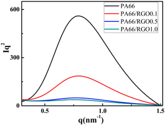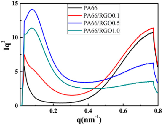 The Lorentz-corrected SAXS curves of neat PA66 and PA66/RGO0.1, PA66/RGO0.5 and PA66/RGO1.0 nanocomposites. The sample-to-detector distance was 2320 mm.