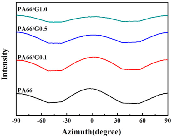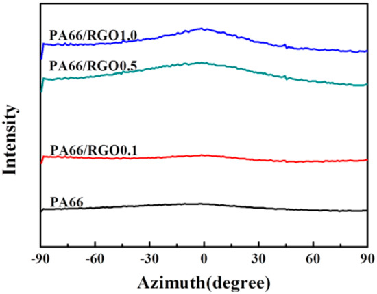 The platy RGO nano-filler can effectively enhance the orientation of nanocomposites [43]. Further study of crystal orientation was carried out using the 2D-SAXS experiment. The azimuthally integrated profiles of Figure 9 and Figure 10 were collected from the outer and center signals of 2D-SAXS patterns, respectively. In the azimuthally integrated profiles of outward scattering signals (Figure 9), the signal intensity weakens. As shown in Figure 10, the 2D-SAXS signal of PA66/RGO nanocomposites was distributed in the meridian direction. It is observed that the orientation degree of the PA66 chain is enhanced in the parallel direction of the flow with the increase of platy RGO. It is consistent with the results of WAXD.