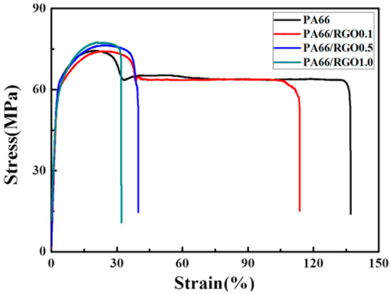 Stress–strain curves of neat PA66 and PA66/RGO0.1 (0.1 wt% RGO), PA66/RGO0.5 (0.5 wt% RGO) and PA66/RGO1.0 (1.0 wt% RGO) nanocomposites.
