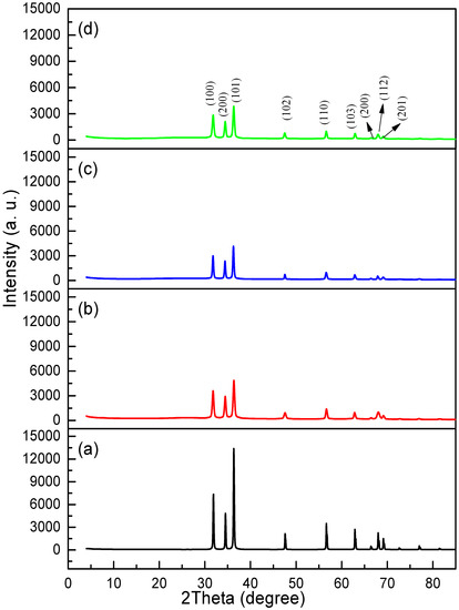 The ZnO nanoparticle XRD patterns prepared with PVP of 3–5 g concentrations are demonstrated in Figure 1b–d. Here, it is evident that from a lower XRD peak intensity, the crystalline sizes of ZnO nanoparticles become smaller corresponding to the increase of PVP concentrations. Table 1 also demonstrates that an increase of PVP levels associates with lower crystalline values. It is clear that ZnO nanoparticle samples exhibit a hexagonal crystal structure based on the diffraction peaks (100, 200, 101, 102, 110, 103, 200, 112, and 201), as per the data from JCPDS card no. 35-1451 [46,48,49].