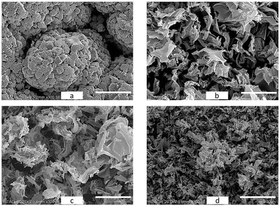 Scanning electron microscopy (SEM) was used to assess the nanoparticles’ surface morphology under both PVP and non-PVP conditions (see Figure 2). A heat-based treatment method was applied in order to prepare the samples for evaluation. An electron beam operating voltage of 20 KV was used at the point of micrographs recording. Figure 2a illustrates the non-PVP production of ZnO at a calcination temperature of 600 °C. The findings show that the structures of the samples were nearly sphere-shaped and homogenously dispersed [51]. The results of the SEM were collected together with a PVP concentration of 3–5 g, as shown in Figure 2b–d. The findings show that the sample exhibited a nanosheet morphology [52,53,54,55] (see Figure 2b,c). As illustrated in Figure 2c,d, the nanosheet quantity increases in line with an increase in the PVP concentration. Finally, as shown in Figure 2d, almost every nanosheet structure became smaller as the PVP concentration increased.