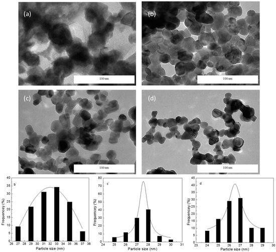 The TEM was used to assess the zinc oxide nanoparticles, which had been prepared with metal nitrates in a water-based solution of a PVP (0, 3, 4, and 5 g) capping agent, designed to restrict particle growth. One sample was prepared without PVP and calcined at 600 °C (Figure 3a). The findings showed that even in the absence of PVP, ZnO was effectively produced. Nonetheless, the findings also showed a lack of homogenous form dispersion, and even accumulation, when PVP was absent. Therefore, nanoparticles produced without the assistance of PVP will become unevenly distributed: the higher surface energy levels result in the accumulation of smaller particles that become larger during calcination. Additionally, the absence of PVP also resulted in an even melting morphology in certain areas as well as a lack of clarity because the smaller particles accumulate and eventually turn into larger ones. Therefore, the experimental process revealed that images and imaging software alone is insufficient for achieving a clear understanding of the average particle size at a calcination temperature of 600 °C. Regarding the PVP-prepared samples, which were also calcined at 600 °C, Figure 3b–d presents the particle size and size dispersal images as produced through the TEM. The findings showed that the particle size dispersal was uniform and the particles’ morphologies were homogenous with an average size of 32 ± 4 nm at a 3 g PVP concentration and 26 ± 3 nm at 5 g PVP. These findings support those of the XRD evaluations.