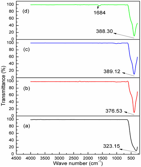 FT-IR spectra of ZnO NPs at various polyvinylpyrrolidone concentration of (a) 0, (b) 3, (c) 4, and (d) 5 g in the range of 280–4000 cm−1.