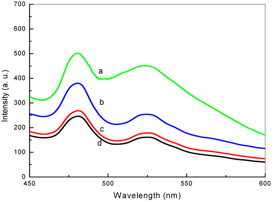 Photoluminescence spectra of the ZnO NPs at various polyvinylpyrrolidone concentration of (a) 0, (b) 3, (c) 4, and (d) 5 g.