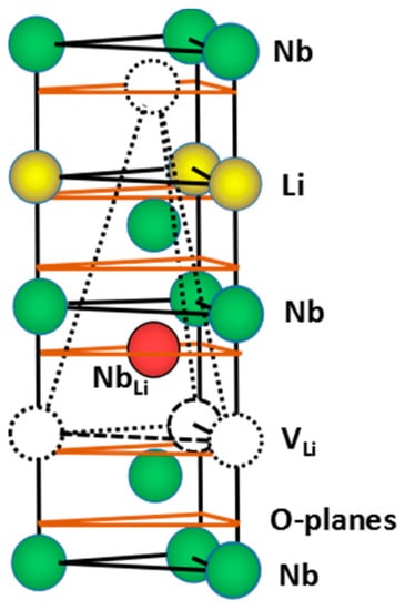 In the literature there are three different models based on Li vacancies [38], Nb vacancies [42], and oxygen vacancies [43] explaining the defect structure of LN. However, the most accepted model, explaining most of the properties of LN, is represented by the Li-site vacancy (V) model: [Li1−5x(NbLi)xV4x][Nb][O3] proposed by Larner et al. [38]. According to this model the structure remains stable up to x = ~0.02 and the congruent melting is for x = 0.018. Figure 1 shows a representative model for the defect structure of CLN [20].