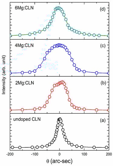 High resolution X-ray diffraction (HRXRD) curves of (a) undoped; (b) 2.0; (c) 4.0; and (d) 6.0 mol % Mg-doped CLN crystals.