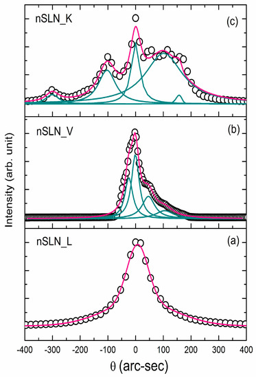 On the other hand, the DCs for nSLN_V (Figure 6b) and nSLN_K (Figure 6c) are characterized by superimposition of a number of peaks signifying the presence of point defects as well as low angle grain boundaries. The peak fitting revealed that the DC of nSLN_V consists of three additional peaks. The two well separated peaks on the right of the main peak correspond to low angle grain boundaries formed due to the employed thermal treatment. The FWHM of the main peak is ~45 arc-sec.