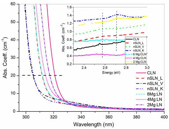 where T is transmittance, R is reflectivity, and d is the sample thickness. Figure 7 shows the absorption spectra of nSLN crystals prepared by different techniques, i.e., nSLN_L, nSLN_K, nSLN_V and the Mg (2, 4, and 6 mol %):CLN crystals along with the spectrum of undoped CLN included for comparison. The absorption spectra are characterized by the fundamental absorption edge (AE) which in LN arises due to the inter-band electronic transition between the 2p orbitals of the O2− (valance band) and the 4d orbitals of the Nb5+ (conduction band) [82]. The AE was estimated as the wavelength at which the absorption coefficient is 20 cm−1 [83] and summarized in Table 2. A blue shift in the fundamental absorption edge of nSLN and Mg doped samples with respect to CLN sample is evident from the plot. The blue shift indicates the influence of intrinsic defects on the fundamental absorption processes and signifies an improvement in the optical band structure and the lattice of LN due to a decrease in intrinsic defects (NbLi+5 and VLi−1) and defect-induced band tailing states that give rise to band narrowing [84]. The disorder in the Nb sub-lattice due to the presence of NbLi5+ antisite defects leads to the distortion in the oxygen octahedron and influences the fundamental AE.