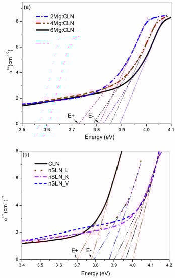 where, is the indirect bandgap energy and hΩ is the energy of the absorbed (+) or emitted (−) phonons needed to conserve the momentum. For estimation of the indirect band-gap energy values of (α)1/2 vs. hν are plotted in Figure 8a,b for all the nSLN and Mg:CLN samples (undoped CLN is included for comparison). The two adjoining linear segments near the band edge describe the phonon assisted fundamental photon absorption process corresponding to the absorption or emission of phonons. The linear fits of the absorption data and their respective intercept values E− and E+ with the energy axis at α = 0 were used to estimate the indirect band-gap and the associated phonon energy using Equation (6). The estimated values are summarized in Table 2.