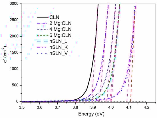 Further, the direct band-gap energy can also be estimated from the direct allowed transition using the Tauc relation (Equation (5)). For estimation, α2 vs. energy (hν) is plotted for all the samples as shown in Figure 9. The steep rise of absorption and its linear fit at higher photon energy depict the direct allowed interband transition [93]. The intercept of the straight line at the energy axis (α2 = 0) yields the direct optical band-gap (Eg) energies which are listed in Table 2. The values show a trend similar to that for the indirect band-gap. The observed direct band-gap energy, for nSLN_V (4.11 eV) is closer to the theoretically estimated value which is 4.7 eV [95]. The observed difference between the theoretically calculated and experimentally measured value is attributed to the excitonic (quasi-particle) effects included in the theoretical model. Referring to the trend in Table 2 it appears that the experimental value will be further closer to the theoretical value [95] if the Li/Nb ratio of the sample approaches unity.