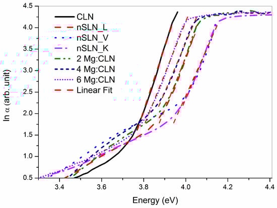 Figure 10 shows the logarithm of absorption coefficient (lnα) vs. incident photo energy plot. As per Equation (8) the linear region shown in the figure near the band absorption edge corresponds to the Urbach tail. The Urbach energy EU was estimated from the inverse of the slope of the linear fit (Table 2). The Urbach energy for CLN (74 meV) is in good agreement with the value (74 meV) estimated by Castillo-Torres [82]. It is to be noted that although there is a decrease in the concentration fo Li vacancies and antisites defects in nSLN samples, the Urbach energy for nSLN crystals (~74 meV) was found to be slightly higher with respect to CLN (65 meV) (Table 2). This is consistent with the observation in HRXRD measurement indicating the fact that the structural defects are more in nSLN samples compared to CLN. Further, the Urbach energy of Mg:CLN is 77, 84, and 76 meV for 2, 4, and 6 mol % Mg doped samples respectively. This is also consistent with the observation in the HRXRD measurements.