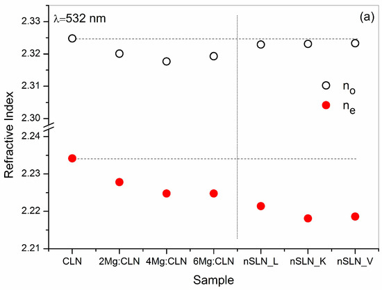 Refractive index (no and ne) of different (a) Mg:CLN; and (b) nSLN crystals at 532 and 1064 nm wavelength.