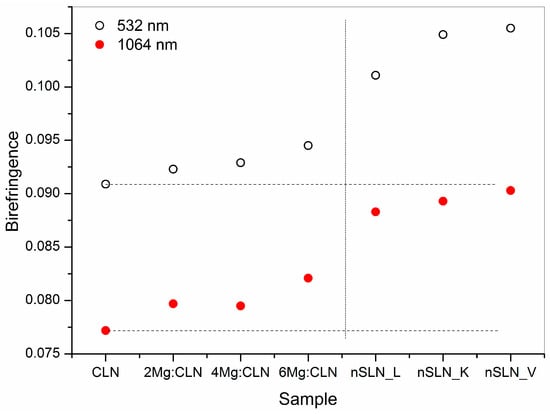 Birefringence at 532 and 1064 nm of differently prepared lithium niobate crystals.