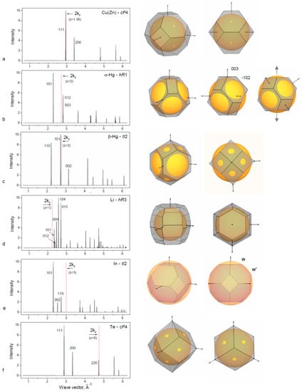 In this work, we selected two groups of fcc based phases: elemental simple sp metals (Table 1) and binary alloy phases (Table 2). Diffraction patterns and constructed Brillouin–Jones zones for these structures are presented in Figure 1 and Figure 2, respectively. Crystal structure description and element groups in the Periodic table are given following Pearson [].