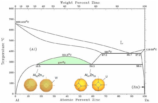 - Fujinaga, Y.; Tasaku, S. The aluminum-zinc phase diagram under high pressure. J. Alloys Compd. 1994, 209, 311–317. [Google Scholar] [CrossRef]