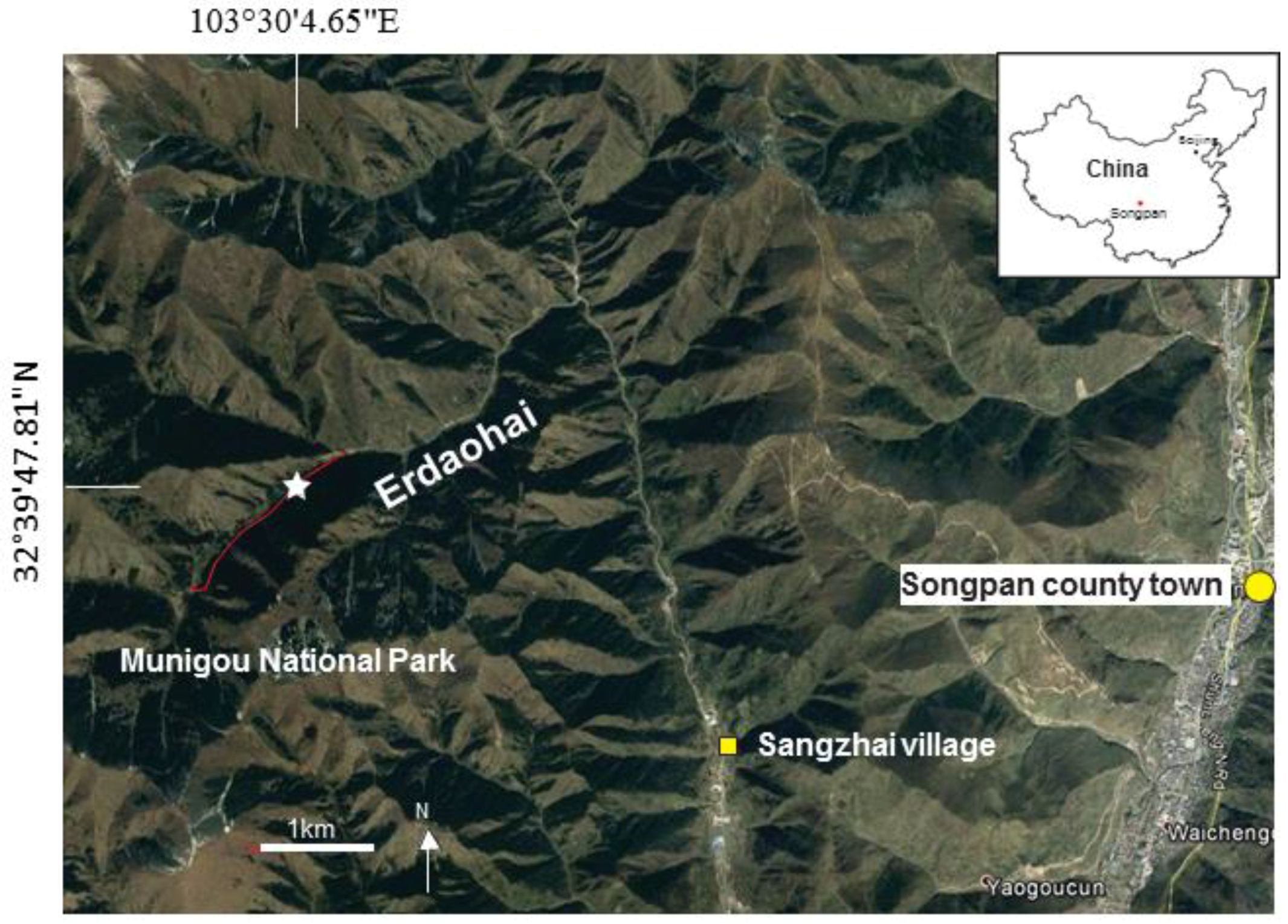 Location of Erdaohai valley (red line) with travertine deposits in the Munigou National Park, north Sichuan, China. The star indicates the location of studied sample (32°39′47.81″ N 103°30′4.65″ E). The satellite image is from Google Earth.