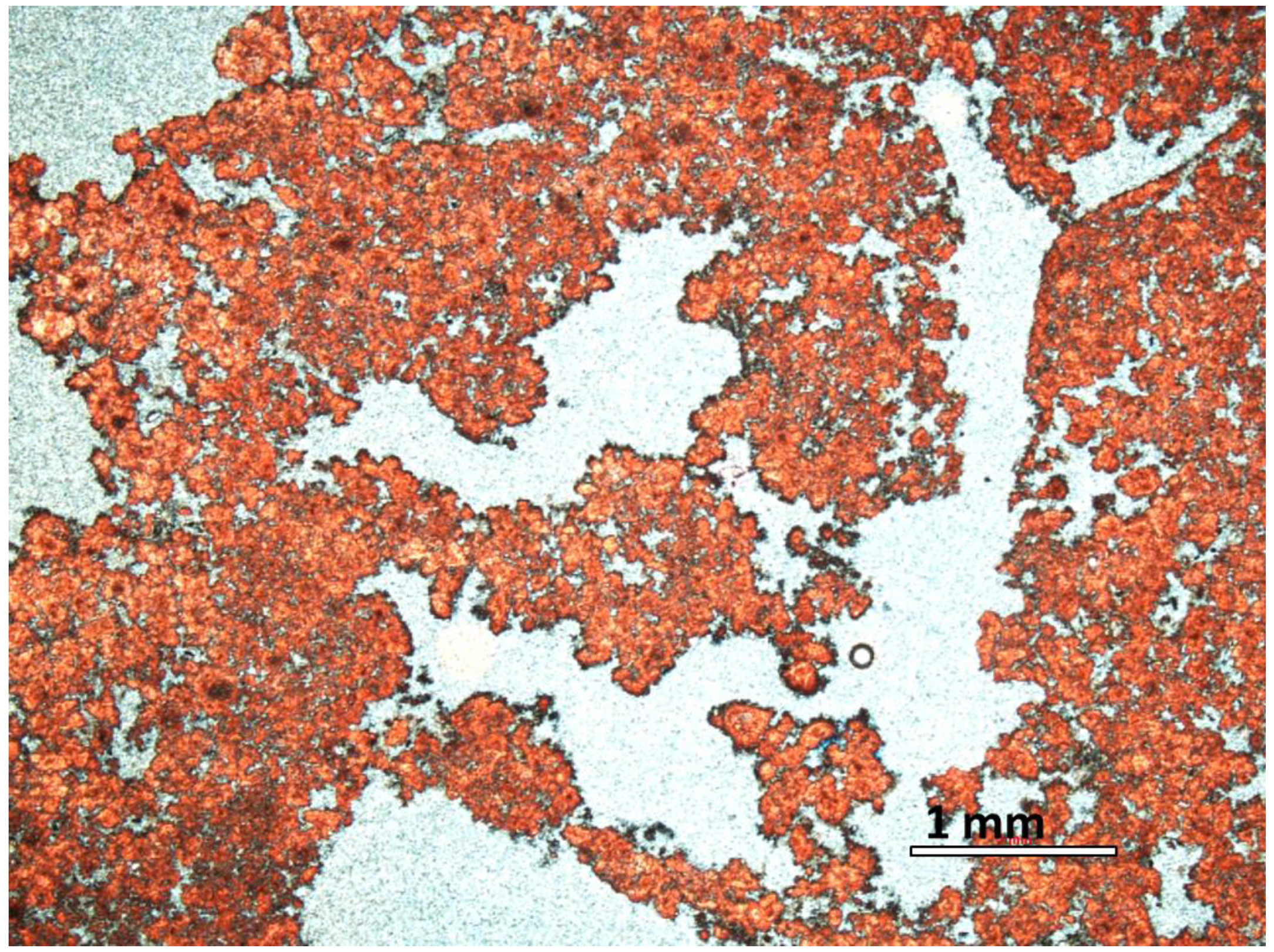 Photomicrograph of calcite, stained with a mixture of potassium ferricyanide and alizarin red S, under plane polarised light.