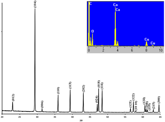 XRD pattern of travertine specimen indexed to a rhombohedral calcite phase. The inset shows a typical EDX spectrum attained from several calcite fragments on the TEM.