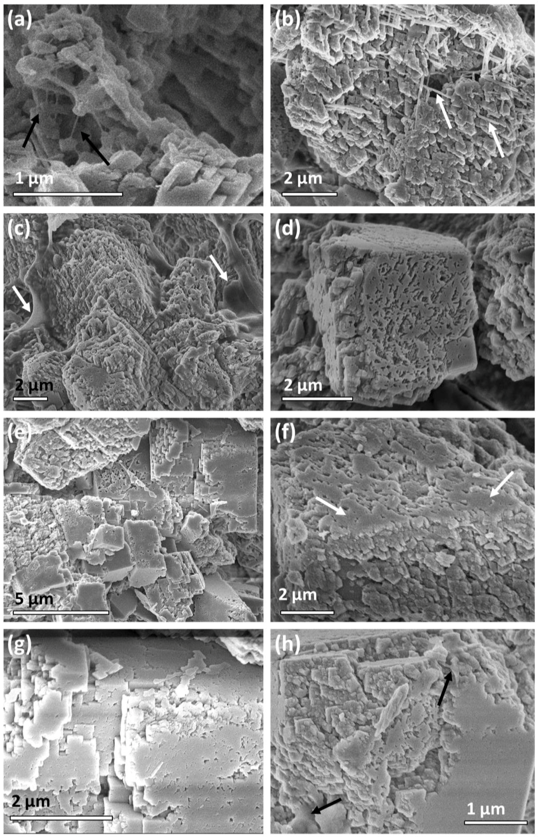 SEM images of calcite particles found in the travertine specimen at various stages of growth. (a) Nanoparticles of calcite trapped inside a matrix of EPS fibres (marked by arrows); (b) An irregularly shaped polycrystalline aggregate. The arrows mark embedded calcite needles; (c) Calcite aggregate composed of a dense arrangement of nanosized building units. The arrows mark EPS molecules; (d) Calcite particle displaying a more regular rhombohedral morphology; (e) Low magnification image showing calcite particles with a relatively smooth surface; (f) Calcite particle exhibiting many single crystalline surface domains as evidence of surface re-crystallisation. The arrows mark large single crystalline regions on the surface of a rhombohedral particle; (g) Calcite particle displaying a significantly smoother surface; A lower magnification SEM image of this particle is shown in the upper right side of (e); (h) A fractured calcite particle exposing a core–shell structure: a thin single crystalline shell surrounding a polycrystalline core; The arrows in (h) mark embedded EPS molecules.