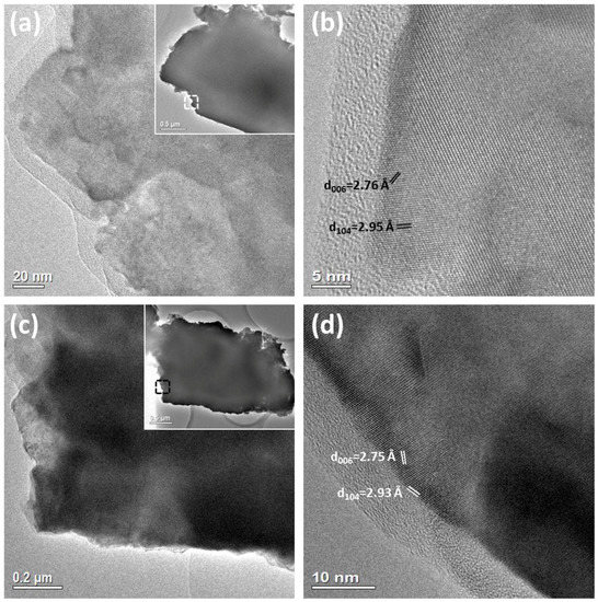 HRTEM was carried out to reveal differences in nanostructure of the calcite travertine particles with different morphologies and to establish if the polyhedral building units in the calcite particles were oriented. The TEM image in Figure 5a as recorded from the edge of a rhombohedral particle shows polyhedral nanoparticles with a dimension of 100 nm. Differences in contrast in the polyhedral particles suggest they are constructed from 10 to 20 nm sized domains. The single crystal-like fringes and the outline of many domains in Figure 5b indicate that all the domains have a uniform orientation. The uniform orientation was further confirmed by recording a selected area electron diffraction (SAED) pattern from a large area of a calcite particle containing many nanocrystallites (Figure S4a). The terminal planes of the surface terraces are parallel (marked by arrows in Figure S4b) which also suggests a uniform orientation. The TEM image in Figure 5c as recorded from another calcite particle shows significantly larger sized (~250 nm) crystallites. Nanodomains with a size of 10–20 nm cannot be distinguished which indicates this calcite particle has a higher crystallinity. D-spacings measured from the marked lattice fringes Figure 5b,d can be indexed to the (006) and (104) crystal planes of calcite with an interplane angle of 44.6°. The pale contrasted amorphous regions observed in HRTEM images (Figure 5b,d) are either pores or EPS rich areas. In addition, TEM provided further evidence of a core–shell structure (Figure S4c,d). A dark contrasted layer with a uniform thickness of 30 nm was observed at the surface of the rhombohedral travertine particle.