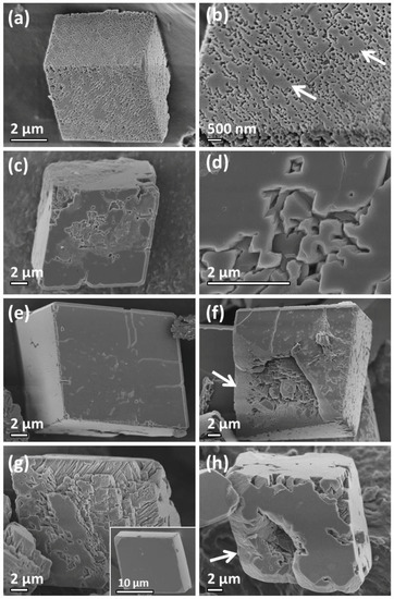 SEM images of synthetic calcite particles prepared in the presence of chitosan with a hydrothermal treatment time of (a,b) 2 h; (c,d) 23 h; (e,f) 3 days; and (g,h) 9 days. The inset of (g) shows an unbroken particle; Low magnification images of the rhombohedral particles are shown in (a,c,e,g); The corresponding high magnification images of their surface are shown in (b,d); and images of fractured particles in (f,h).