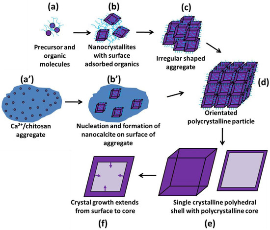 Although the mid- and final-stage growth of the natural and synthetic calcite in the present work is very similar, our microstructural analysis implies that there may be some differences in the early growth steps. Growth of the synthetic calcite particles began with the formation of irregularly shaped aggregates of chitosan and Ca(NO3)(H2O)3 precursor molecules/ions (Figure 7a’) [18]. This was followed by the formation of calcite crystallites, which were often embedded in the composite particles (Figure 7b’). Richie et al. [18] found the surface of the irregular composite particles was the most active site for the nucleation of calcite. This was said to be due to the trapping of the Ca2+ cations by the chitosan molecules and the slow release of CO32− anions from the decomposition of urea. The –OH and –NH2 functional groups of chitosan bound on the surface of the calcite crystallites suppressed their growth and prevented the growth of free crystals. Instead, they underwent aggregation to form polycrystalline particles with a rhombohedral appearance (Figure 7d).