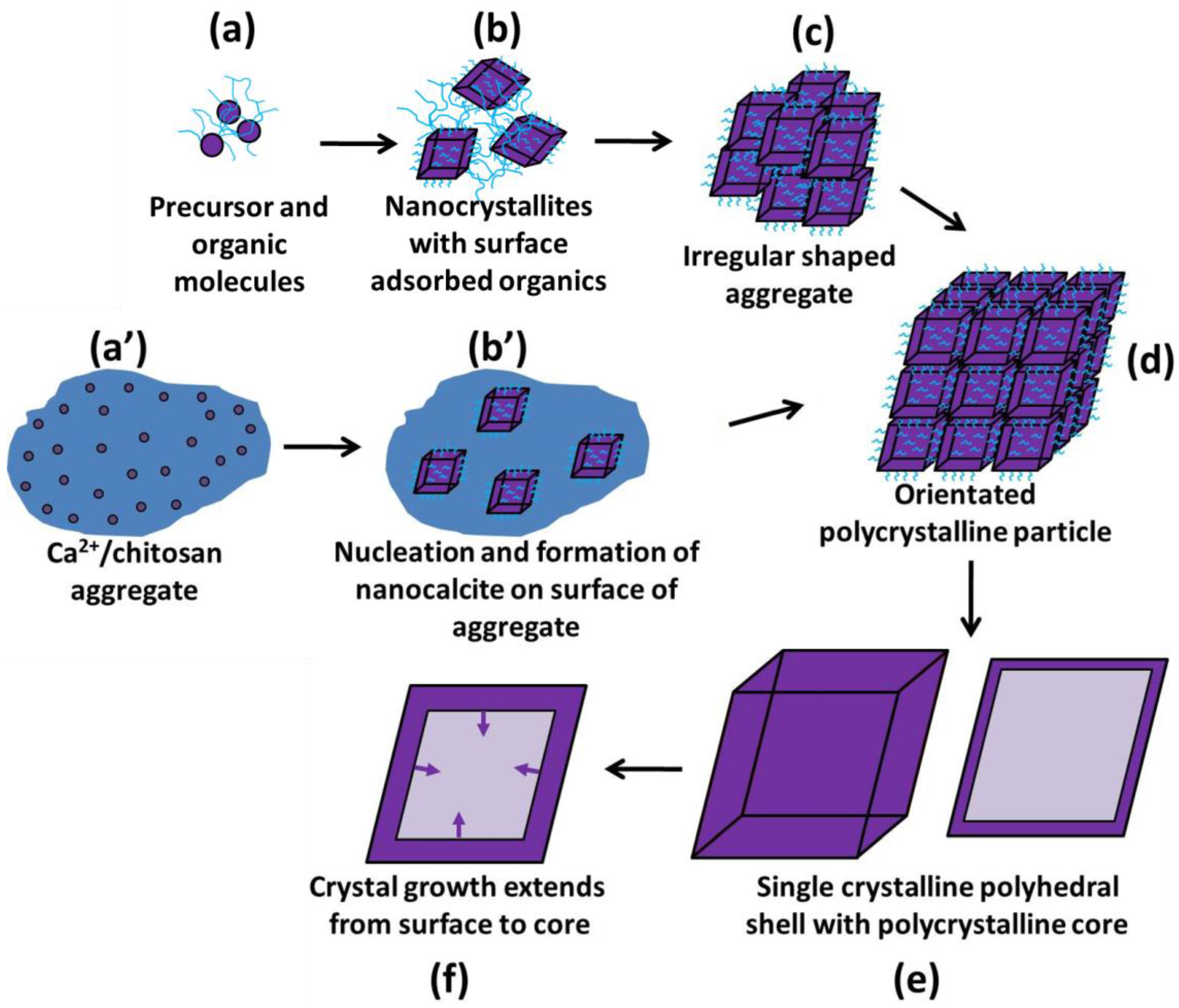 Following an electron microscopic analysis of calcite particles in a travertine specimen and synthetic calcite prepared in the presence of chitosan molecules [18] with a series of different reaction times, significant evidence has been found to prove that the calcite particles in both these natural and synthetic systems do not grow via a classical route. Instead a non-classical reversed crystal growth route is proposed as illustrated by the six principle steps in Figure 7.