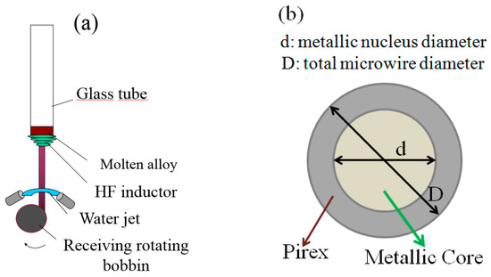 (a) Schematic picture of the fabrication process of glass-coated microwires. (Reproduced from reference [10], Figure 1), (b) cross section of a microwire.