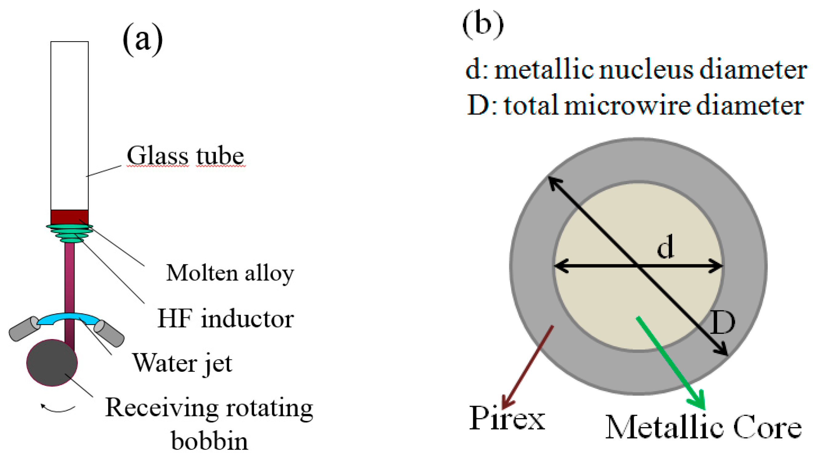 The microstructure and hence its physical properties of a microwire essentially depend on the quenching rate. Detailed information on technological processes, i.e., the interaction of the molt alloy with the glass, thermal regimes of formation of the cast microwire, casting parameters and their limits affecting by the quenching rate, and the diameter of the microwire and electromagnetic and electro-hydrodynamic processes in the system inductor-droplet were described for non-magnetic microwires [36], and it has been overviewed in relatively recent book chapters and regular publications [8,17,38,39].