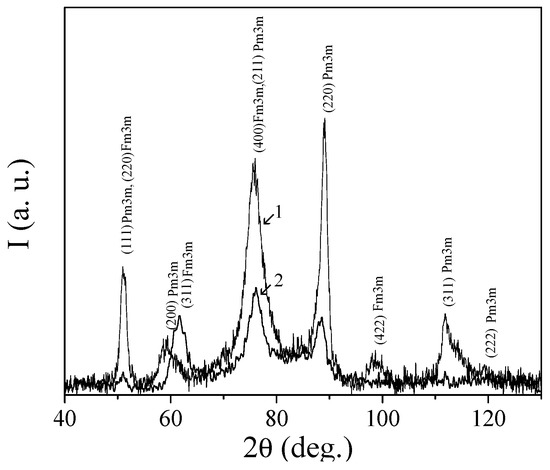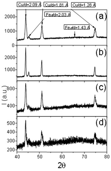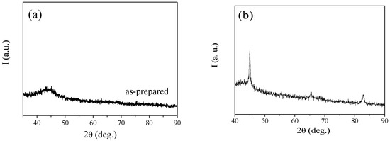 Most of the as-prepared Finemet-type microwires here studied present an amorphous structure (see Figure 2a the XRD patterns of one of the as-prepared Fe70.8Cu1Nb3.1Si14.5B10.6). In contrast, a nanocrystalline structure has been achieved in the as-prepared Hitperm-type microwires (Figure 2b).