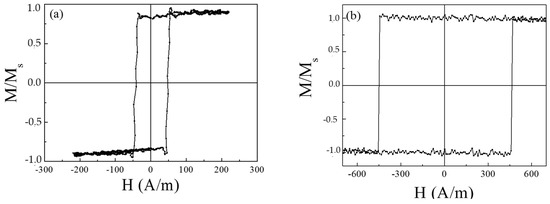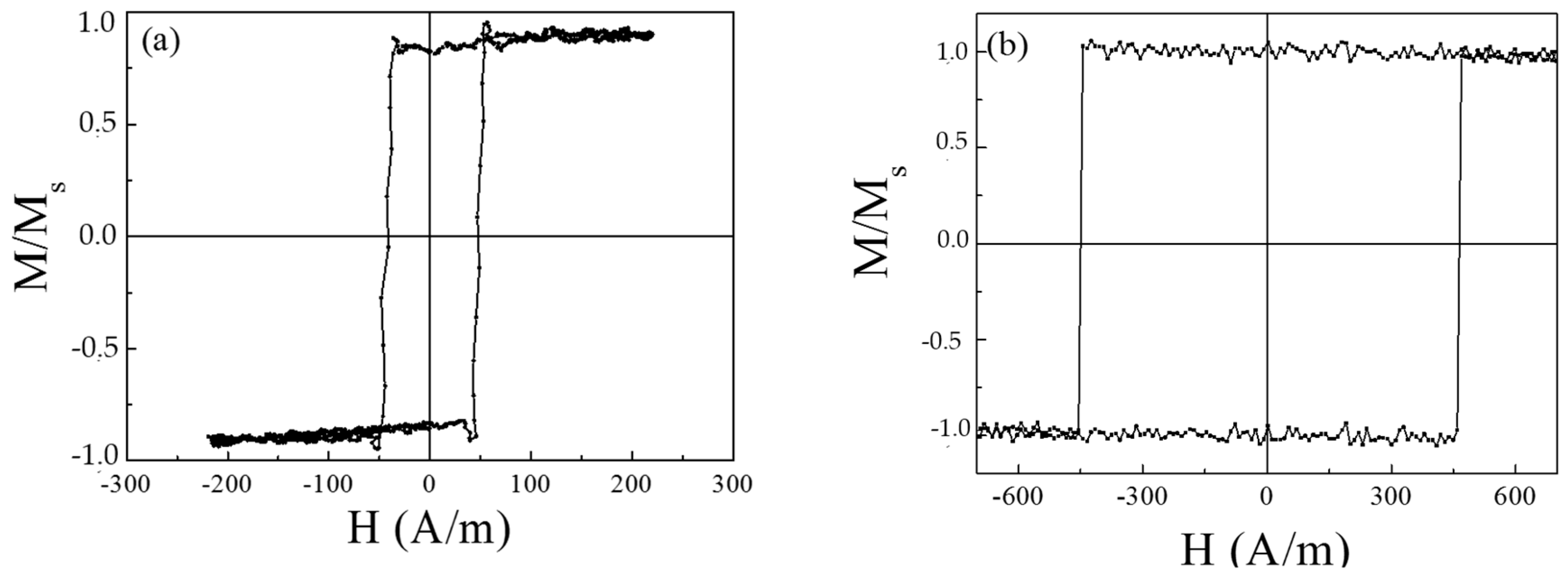 Hysteresis loops of as-prepared Fe70.8Cu1Nb3.1Si16B9.1microwires with ρ = 0.62 (a) and as-prepared Fe38.5Co38.5B18Mo4Cu1 with ρ = 0.60 (b). Reproduced from reference [10], Figure 5.