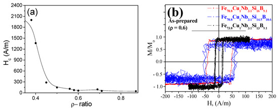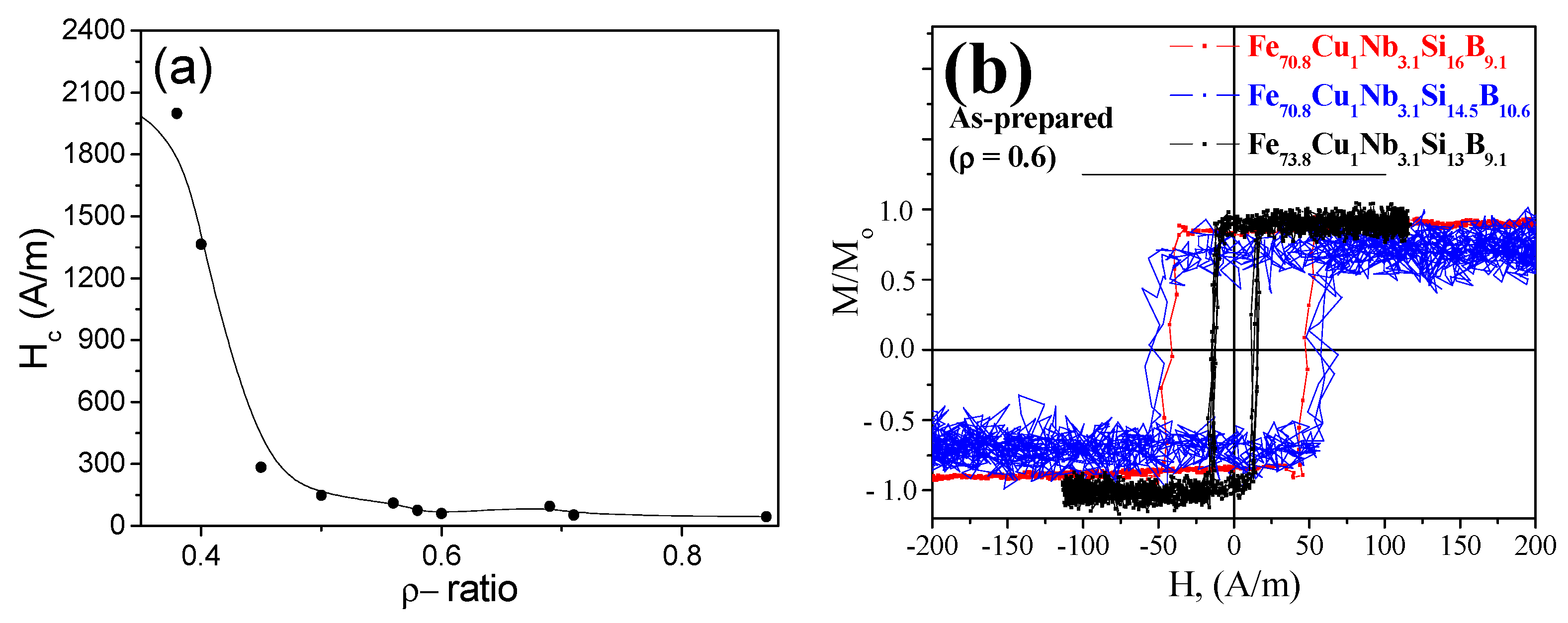 Coercive field dependence on ρ-ratio for as-prepared Fe70.8Cu1Nb3.1Si16B9.1 glass-coated micorwires (a), hysteresis loops of as-prepared Fe70.8Cu1Nb3.1Si16B9.1, Fe70.8Cu1Nb3.1Si14.5B10.6, and Fe73.8Cu1Nb3.1Si13B9.1 Finemet glass-coated microwires with the same ρ-ratio = 0.6 (b). Reproduced from reference [47] Figure 1.