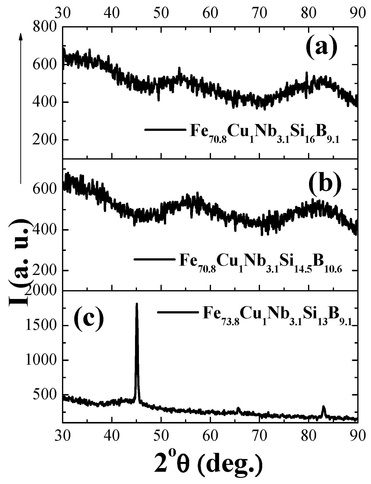 XRD of as-prepared Fe70.8Cu1Nb3.1Si16B9.1 (a), Fe70.8Cu1Nb3.1Si14.5B10.6 (b), and Fe73.8Cu1Nb3.1Si13B9.1 (c) Finemet glass-coated microwires with the same ρ-ratio = 0.6. Reproduced from reference [47], Figure 2.